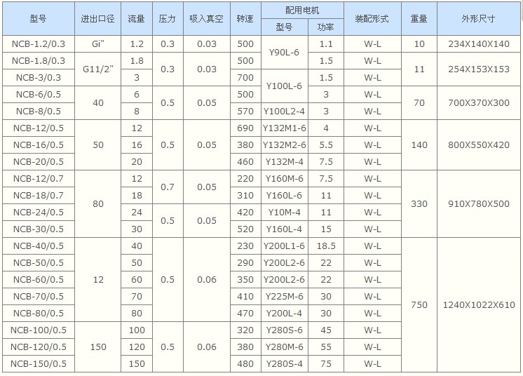 NCB高粘度轉(zhuǎn)子泵性能參數(shù)表: